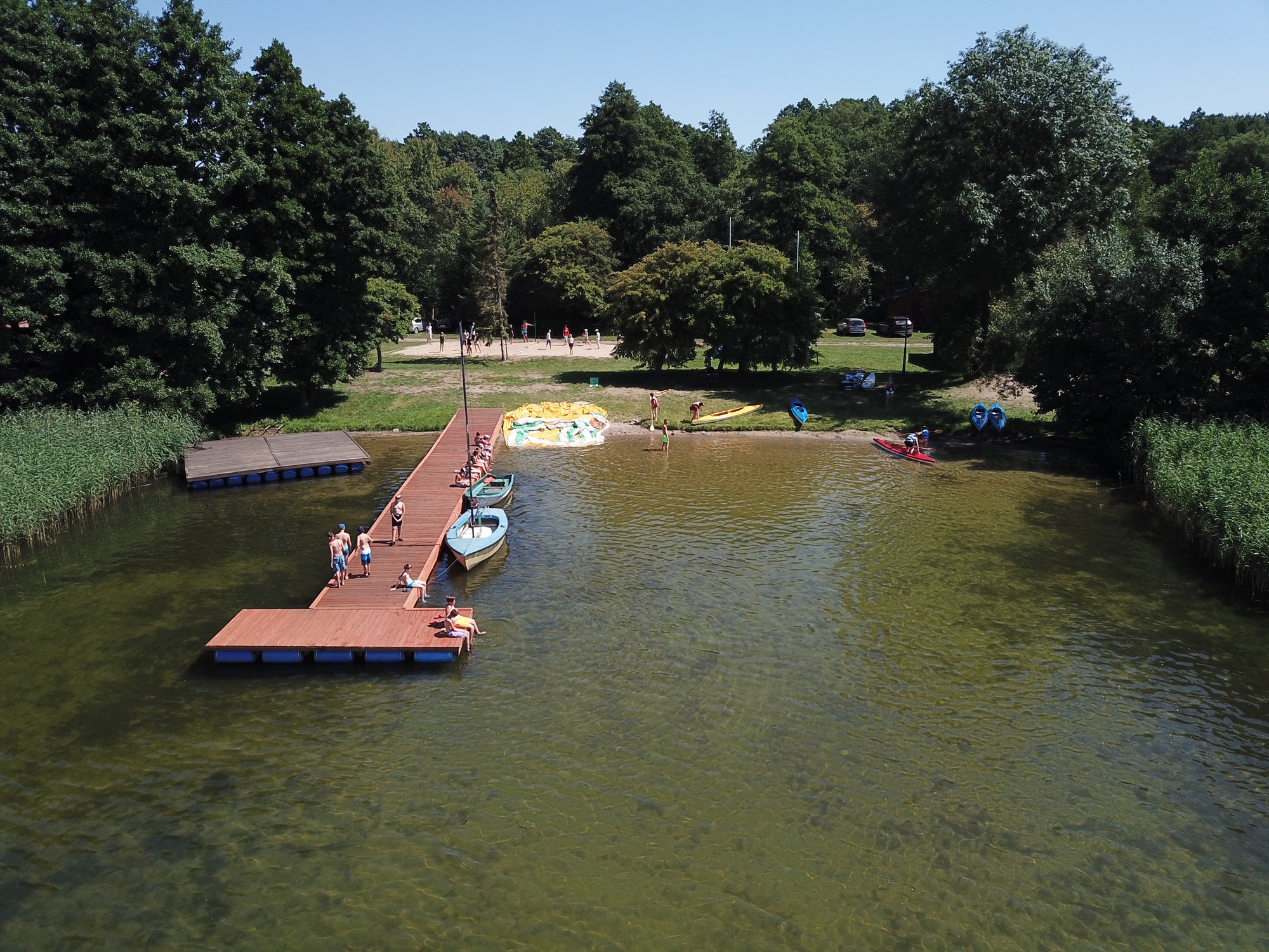 Ośrodek jest w pełni ogrodzony, posiada własną plażę z 30-metrowym pomostem. Na terenie obiektu przewidziano miejsce na catering, zabawy integracyjne, mały lasek, boisko do piłki siatkowej plażowej, ściankę wspinaczkową. Ponadto na terenie ośrodka znajdują się drewniane domki letniskowe z łazienkami, otoczone bardzo dużą ilością zieleni. Do dyspozycji mamy około 15 tys. m2 terenu.